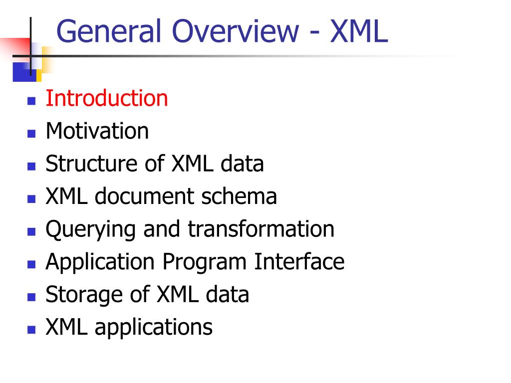 General Overview - XML • Introduction • Motivation • Structure of XML data • XML document schema • Querying and transformation • Application Program Interface • Storage of XML data • XML applications