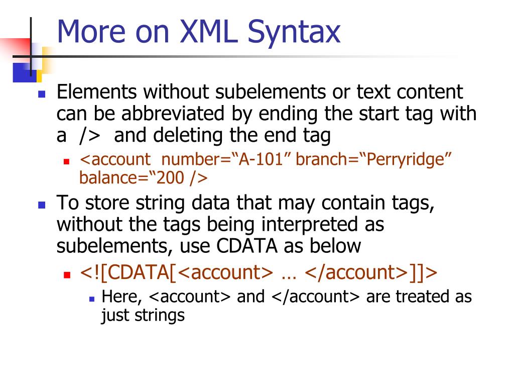 More on XML Syntax • Elements without subelements or text content can be abbreviated by ending the start tag with a /> and deleting the end tag • <account number=“A-101” branch=“Perryridge” balance=“200 /> • To store string data that may contain tags, without the tags being interpreted as subelements, use CDATA as below • <![CDATA[<account> … </account>]]> • Here, <account> and </account> are treated as just strings