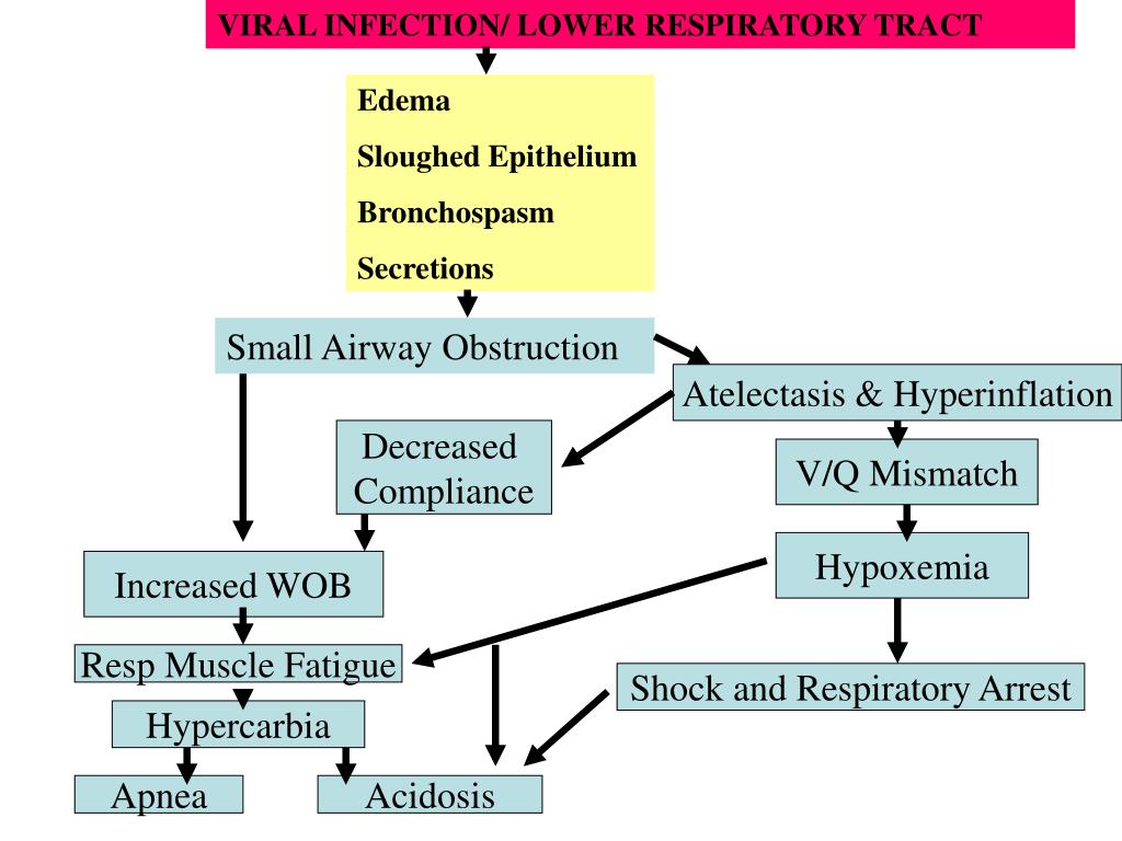 VIRAL INFECTION/ LOWER RESPIRATORY TRACT Edema Sloughed Epithelium Bronchospasm Secretions Small Airway Obstruction Atelectasis & Hyperinflation Decreased Compliance V/Q Mismatch Hypoxemia Increased WOB Resp Muscle Fatigue Shock and Respiratory Arrest Hypercarbia Apnea Acidosis