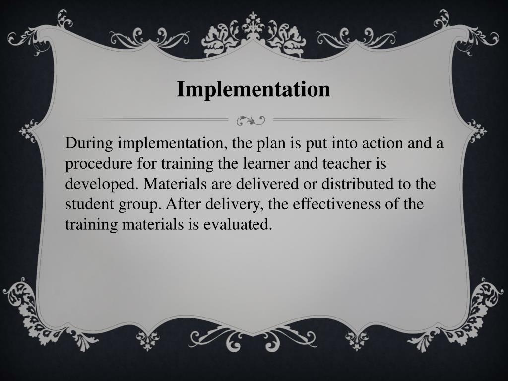 Implementation During implementation, the plan is put into action and a procedure for training the learner and teacher is developed. Materials are delivered or distributed to the student group. After delivery, the effectiveness of the training materials is evaluated.