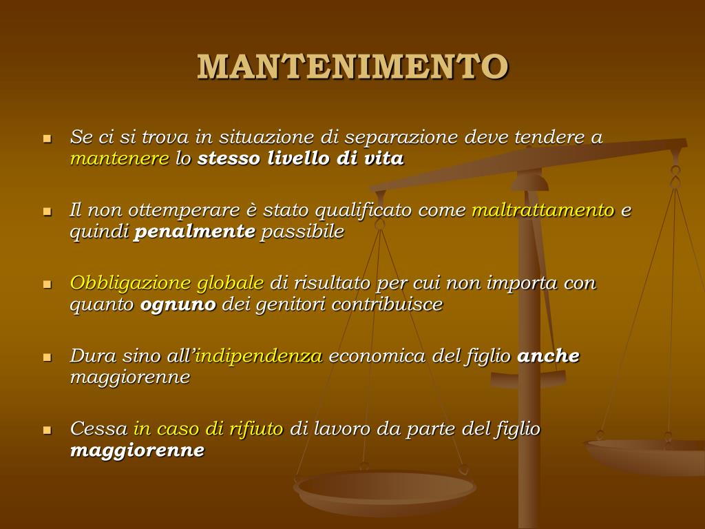 MANTENIMENTO • Se ci si trova in situazione di separazione deve tendere a mantenere lo stesso livello di vita • Il non ottemperare è stato qualificato come maltrattamento e quindi penalmente passibile • Obbligazione globale di risultato per cui non importa con quanto ognuno dei genitori contribuisce • Dura sino all’indipendenza economica del figlio anche maggiorenne • Cessa in caso di rifiuto di lavoro da parte del figlio maggiorenne