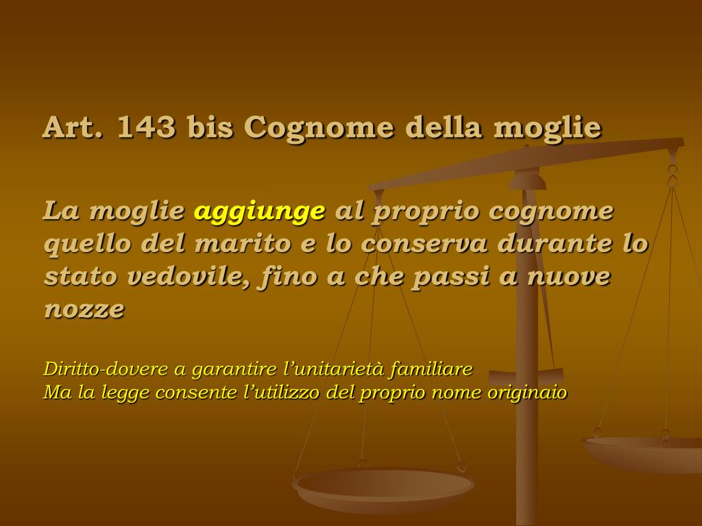Art. 143 bis Cognome della moglieLa moglie aggiunge al proprio cognome quello del marito e lo conserva durante lo stato vedovile, fino a che passi a nuove nozzeDiritto-dovere a garantire l’unitarietà familiareMa la legge consente l’utilizzo del proprio nome originaio