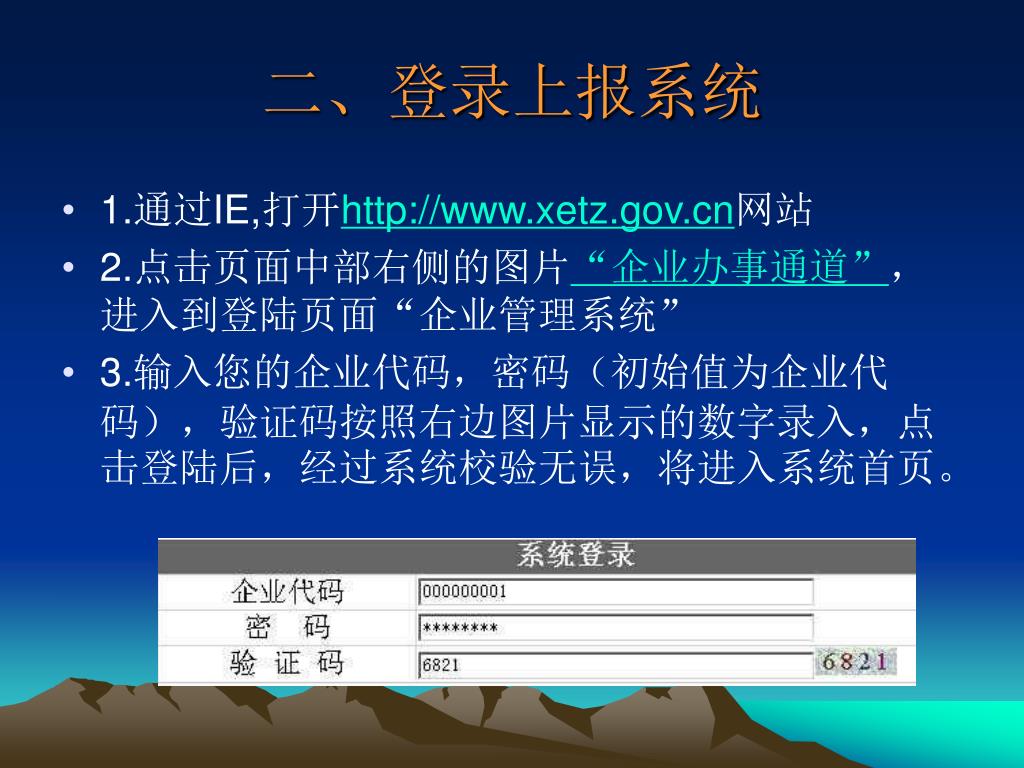 二、登录上报系统 • 1.通过IE,打开http://www.xetz.gov.cn网站 • 2.点击页面中部右侧的图片“企业办事通道”,进入到登陆页面“企业管理系统” • 3.输入您的企业代码,密码(初始值为企业代码),验证码按照右边图片显示的数字录入,点击登陆后,经过系统校验无误,将进入系统首页。