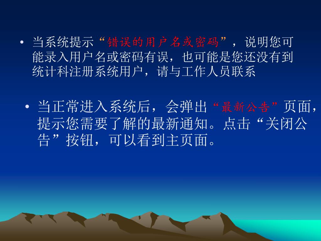 当系统提示“错误的用户名或密码”,说明您可能录入用户名或密码有误,也可能是您还没有到统计科注册系统用户,请与工作人员联系当系统提示“错误的用户名或密码”,说明您可能录入用户名或密码有误,也可能是您还没有到统计科注册系统用户,请与工作人员联系 • 当正常进入系统后,会弹出“最新公告”页面,提示您需要了解的最新通知。点击“关闭公告”按钮,可以看到主页面。