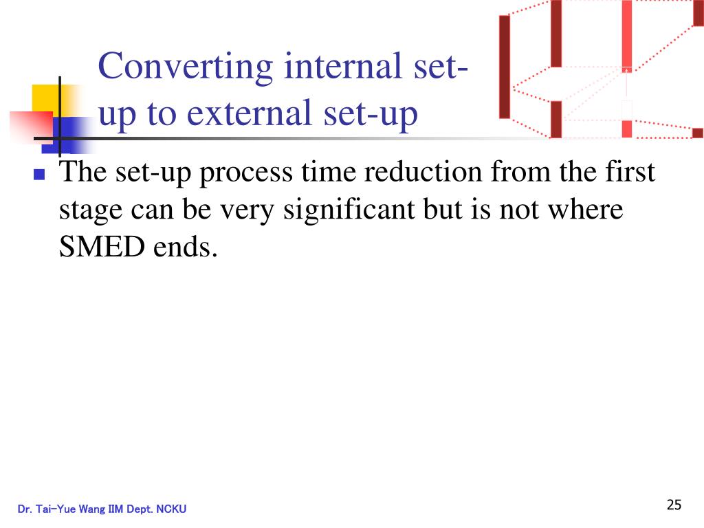 Converting internal set-up to external set-up • The set-up process time reduction from the first stage can be very significant but is not where SMED ends.
