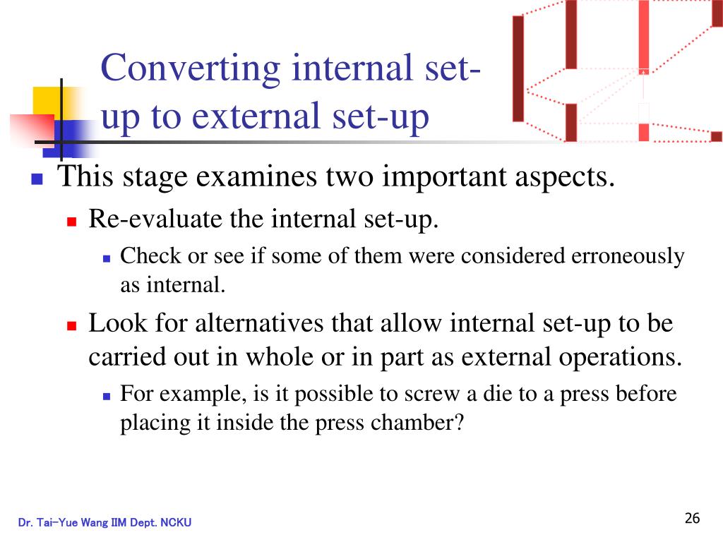 Converting internal set-up to external set-up • This stage examines two important aspects. • Re-evaluate the internal set-up. • Check or see if some of them were considered erroneously as internal. • Look for alternatives that allow internal set-up to be carried out in whole or in part as external operations. • For example, is it possible to screw a die to a press before placing it inside the press chamber?