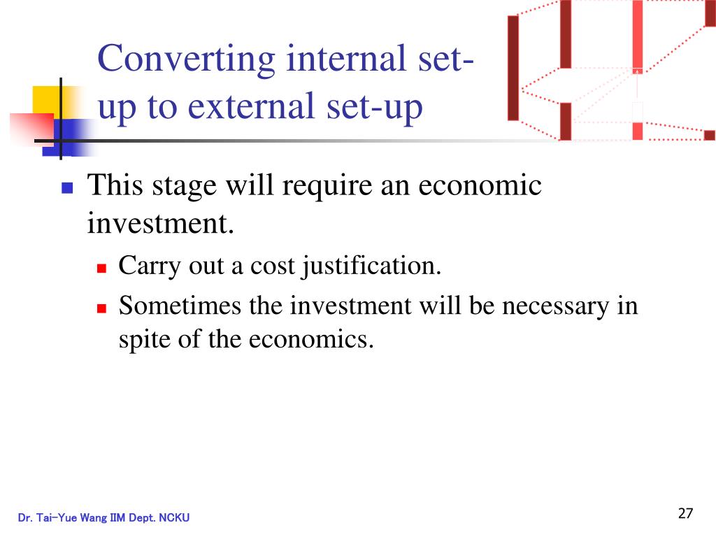 Converting internal set-up to external set-up • This stage will require an economic investment. • Carry out a cost justification. • Sometimes the investment will be necessary in spite of the economics.