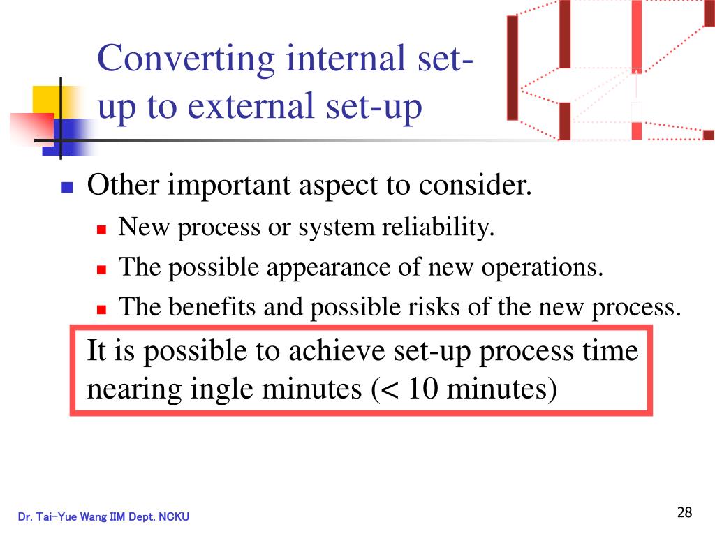 Converting internal set-up to external set-up • Other important aspect to consider. • New process or system reliability. • The possible appearance of new operations. • The benefits and possible risks of the new process. It is possible to achieve set-up process time nearing ingle minutes (< 10 minutes)