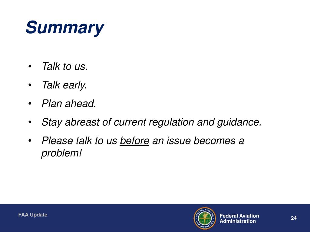 Summary • Talk to us. • Talk early. • Plan ahead. • Stay abreast of current regulation and guidance. • Please talk to us before an issue becomes a problem!