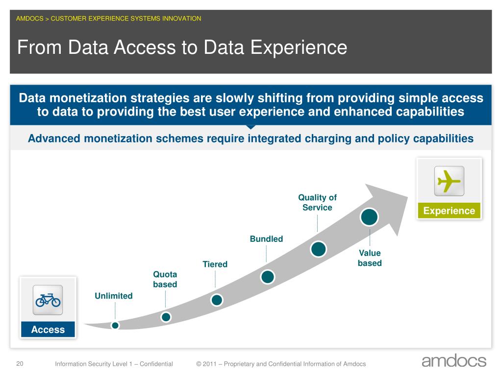 From Data Access to Data Experience Data monetization strategies are slowly shifting from providing simple access to data to providing the best user experience and enhanced capabilities Advanced monetization schemes require integrated charging and policy capabilities Quality of Service Bundled Value based Tiered Quota based Unlimited Access Experience