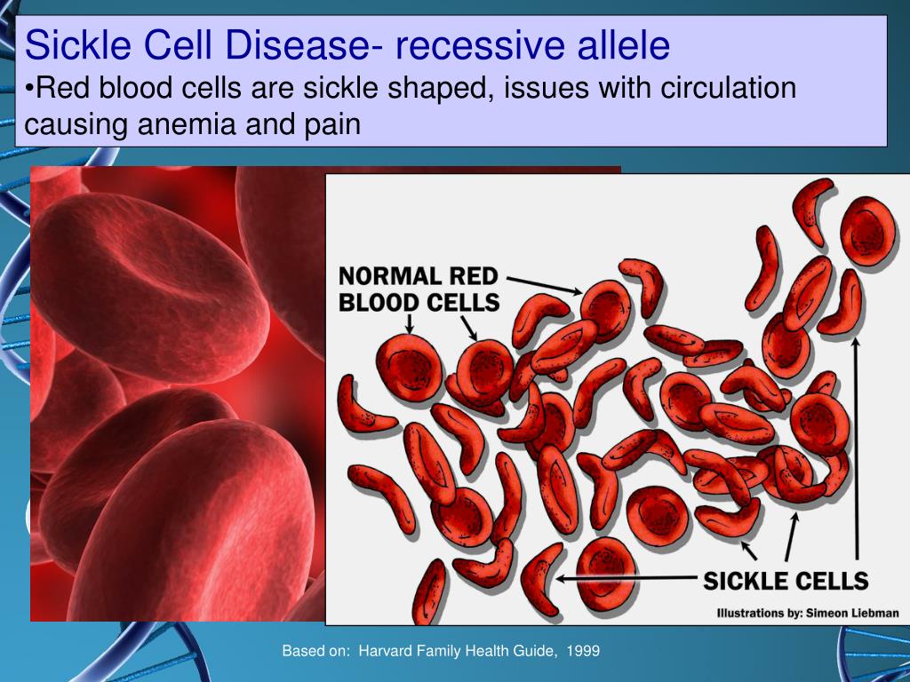 Sickle Cell Disease- recessive allele • Red blood cells are sickle shaped, issues with circulation causing anemia and pain Based on: Harvard Family Health Guide, 1999