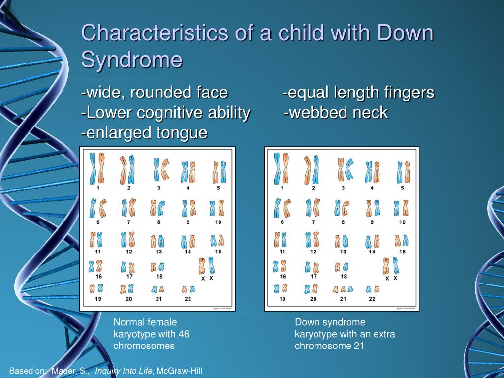 Characteristics of a child with Down Syndrome -wide, rounded face -equal length fingers -Lower cognitive ability -webbed neck -enlarged tongue Normal female karyotype with 46 chromosomes Down syndrome karyotype with an extra chromosome 21 Based on: Mader, S., Inquiry Into Life, McGraw-Hill