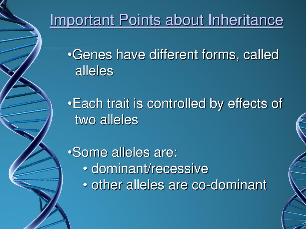 Important Points about Inheritance • Genes have different forms, called • alleles • Each trait is controlled by effects of • two alleles • Some alleles are: • dominant/recessive • other alleles are co-dominant