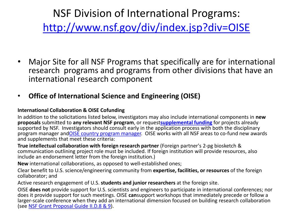 NSF Division of International Programs: http://www.nsf.gov/div/index.jsp?div=OISE • Major Site for all NSF Programs that specifically are for international research programs and programs from other divisions that have an international research component • Office of International Science and Engineering (OISE) International Collaboration & OISE Cofunding In addition to the solicitations listed below, investigators may also include international components in new proposals submitted to any relevant NSF program, or requestsupplemental fundingfor projects already supported by NSF. Investigators should consult early in the application process with both the disciplinary program manager andOISE country program manager. OISE works with all NSF areas to co-fund new awards and supplements that meet these criteria: True intellectual collaboration withforeign research partner (Foreign partner's 2-pg biosketch & communication outlining project role must be included. If foreign institution will provide resources, also include an endorsement letter from the foreign institution.) New international collaborations, as opposed to well-established ones; Clear benefit to U.S. science/engineering community from expertise, facilities, or resources of the foreign collaborator; and Active research engagement of U.S. students and junior researchers at the foreign site. OISE does not provide support for U.S. scientists and engineers to participate in international conferences; nor does it provide support for such meetings. OISE cansupport workshops that immediately precede or follow a larger-scale conference when they add an international dimension focused on building research collaboration (see NSF Grant Proposal Guide II.D.8 & 9).