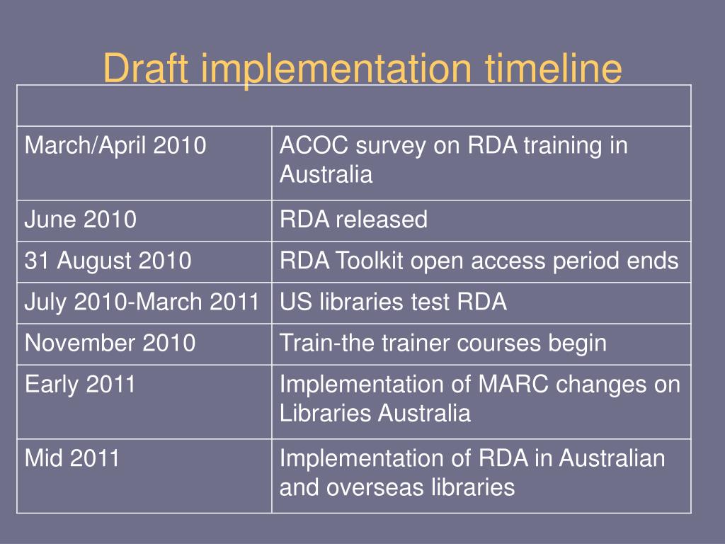 Further information • Australian implementation http://www.nla.gov.au/lis/stndrds/grps/acoc/rda.html Enquiries: nlarda@nla.gov.au • Subscription options and Australian pricing http://www.rdatoolkit.org/ • MARC changes to support RDA http://www.loc.gov/marc/RDAinMARC29.html • US testing http://www.loc.gov/bibliographic-future/rda/index.html