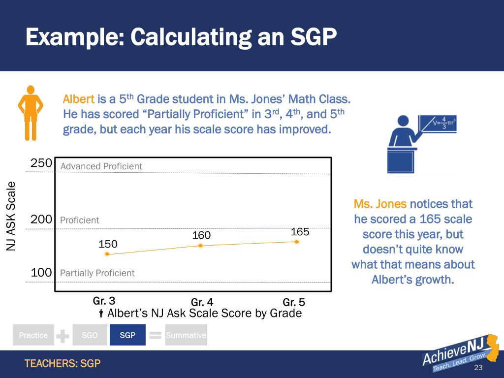 Summative Rating Timeline Rationale Teachers in tested grades and subjects in New Jersey will not receive their SGP scores in time for their summative conference. There are several reasons for this delay: • Full Year Snapshot of Growth: New Jersey does not give the NJASK until May. • Emphasis on Writing: The NJASK has more constructed response and long answer questions than many other states, so the test takes longer to score. • Careful Process: Once scores are finalized, there is a careful process for calculating student and teacher level SGP scores. Practice SGO SGP Summative Teachers
