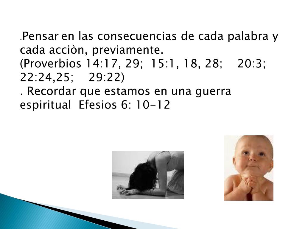 .Pensaren las consecuencias de cada palabra y cada acciòn, previamente. (Proverbios 14:17, 29; 15:1, 18, 28; 20:3; 22:24,25; 29:22) . Recordar que estamos en una guerra espiritual Efesios 6: 10-12