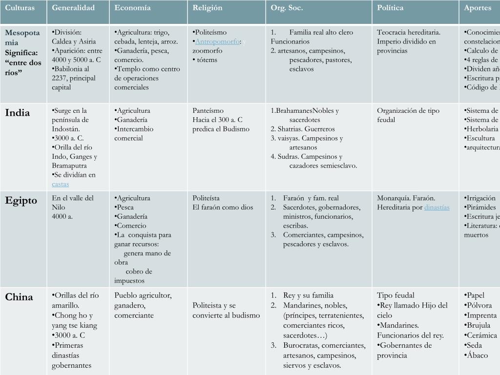 Inicio de la Civilización Periodo preclásico en Mesoamérica Época Medieval Civilizaciones del Mediterráneo Civilizaciones Agrícolas 5000 a. n e 3000 a. n e 2000 a. n e 1000 a. n e 1 n. e 500 n. e 1000 n. e 6000 a. n e 7000 a. n e 4000 a. n e Fin de la Edad Antigua Caída del Impero Romano Cultivo de maíz en América Cultivo de cebada en África Fundación de Roma Primeros centros urbanos en el Indo Inicio de escritura en Mesopotamia Cultivo de arroz en China Época de oro de Grecia Construyen pirámides de Egipto Cultivo de trigo en Europa Introducción de arado Aparece la rueda en Mesopotamia Centros urbanos Mayas Principios de agricultura