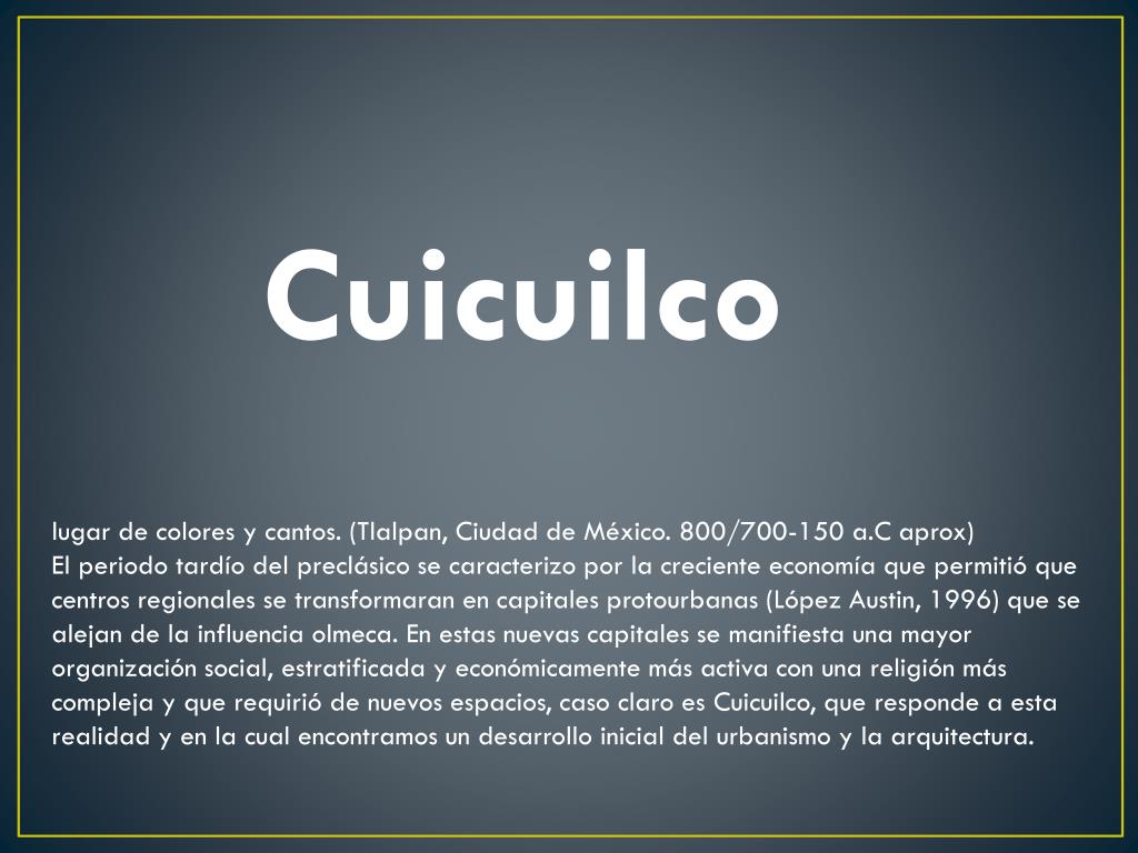 Cuicuilco lugar de colores y cantos. (Tlalpan, Ciudad de México. 800/700-150 a.Caprox)El periodo tardío del preclásico se caracterizo por la creciente economía que permitió que centros regionales se transformaran en capitales protourbanas (López Austin, 1996) que se alejan de la influencia olmeca. En estas nuevas capitales se manifiesta una mayor organización social, estratificada y económicamente más activa con una religión más compleja y que requirió de nuevos espacios, caso claro es Cuicuilco, que responde a esta realidad y en la cual encontramos un desarrollo inicial del urbanismo y la arquitectura.