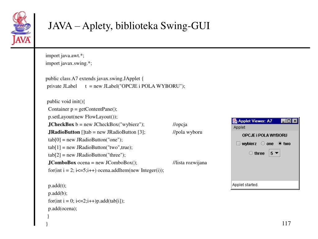 JAVA – Aplety, biblioteka Swing-GUI import java.awt.*; import javax.swing.*; public class A7 extends javax.swing.JApplet { private JLabel t = new JLabel("OPCJE i POLA WYBORU"); public void init(){ Container p = getContentPane(); p.setLayout(new FlowLayout()); JCheckBox b = new JCheckBox("wybierz"); //opcja JRadioButton []tab = new JRadioButton [3]; //pola wyboru tab[0] = new JRadioButton("one"); tab[1] = new JRadioButton("two",true); tab[2] = new JRadioButton("three"); JComboBox ocena = new JComboBox(); //lista rozwijana for(int i = 2; i<=5;i++) ocena.addItem(new Integer(i)); p.add(t); p.add(b); for(int i = 0; i<=2;i++)p.add(tab[i]); p.add(ocena); } }