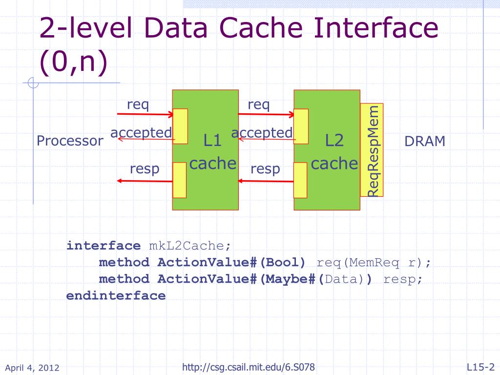 Realistic Memories and Caches – Part III Li- Shiuan Peh Computer Science & Artificial Intelligence Lab. Massachusetts Institute of Technology. 2-level Data Cache Interface (0,n). req. req. accepted. accepted. L1 cache. L2 cache. Processor. DRAM. ReqRespMem. resp. resp.
