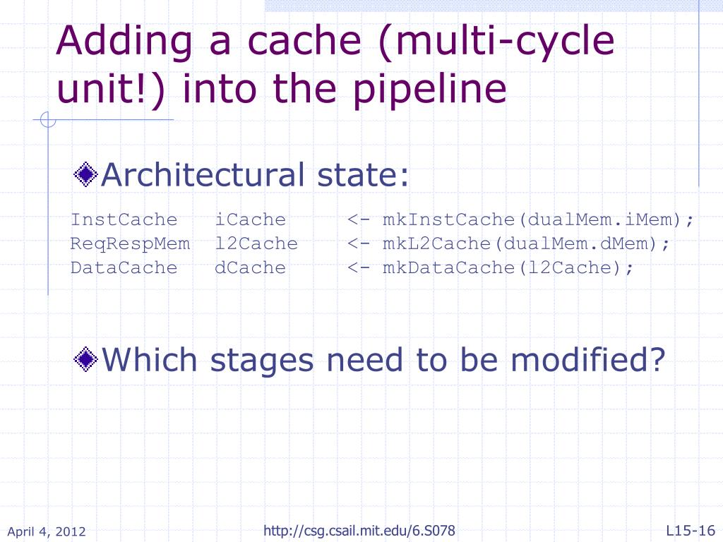 Adding a cache (multi-cycle unit!) into the pipeline • Architectural state: • Which stages need to be modified? InstCacheiCache <- mkInstCache(dualMem.iMem); ReqRespMem l2Cache <- mkL2Cache(dualMem.dMem); DataCachedCache <- mkDataCache(l2Cache); http://csg.csail.mit.edu/6.S078