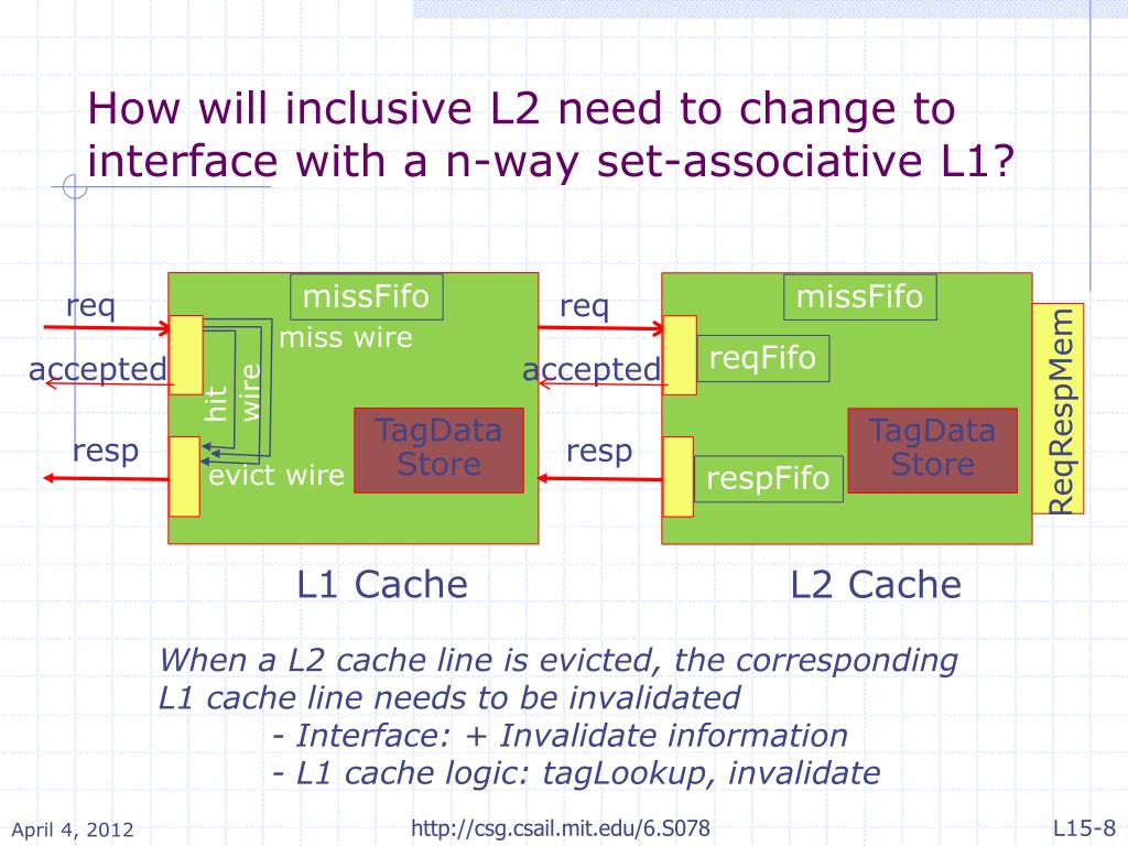 dirty case else if (hitOrMiss.dirty) begin let line <- store.dataAccess(CacheDataReq{id: hitOrMiss.id, reqType: tagged InvalidateLine}); mem.reqEnq(MemReq{op: St, addr: hitOrMiss.addr, data: unpack(pack(line.Line))}); end else What about corresponding line in L1? http://csg.csail.mit.edu/6.S078