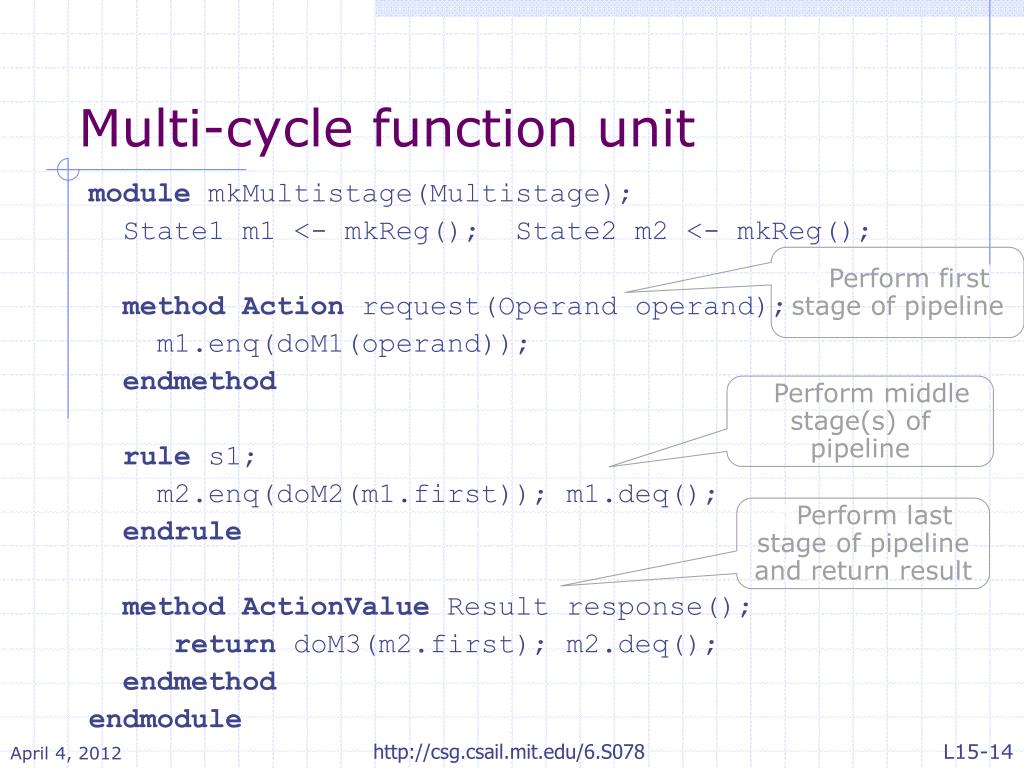 Multi-cycle function unit module mkMultistage(Multistage); State1 m1 <- mkReg(); State2 m2 <- mkReg(); method Action request(Operand operand); m1.enq(doM1(operand)); endmethod rules1; m2.enq(doM2(m1.first)); m1.deq(); endrule method ActionValueResult response(); return doM3(m2.first); m2.deq(); endmethod endmodule • Perform first stage of pipeline • Perform middle stage(s) of pipeline • Perform last stage of pipeline and return result http://csg.csail.mit.edu/6.S078