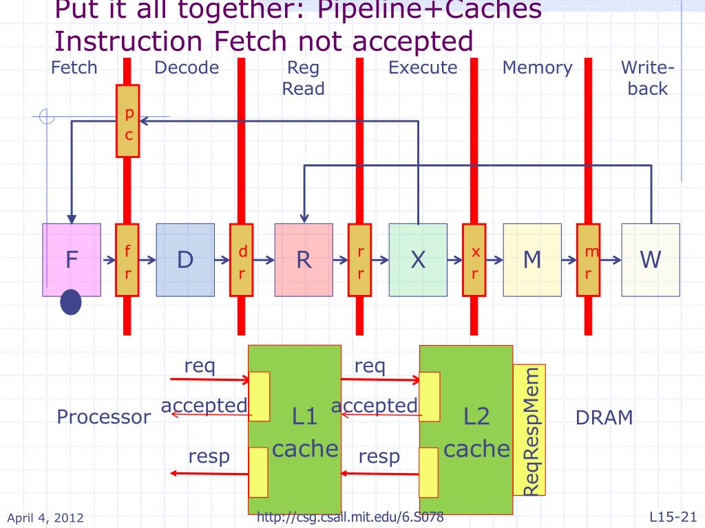 Put it all together: Pipeline+CachesInstruction Fetch Miss Fetch Decode RegRead Execute Memory Write-back req req pc accepted accepted resp resp F D R X M W fr dr rr xr mr L1 cache L2 cache Processor DRAM ReqRespMem http://csg.csail.mit.edu/6.S078