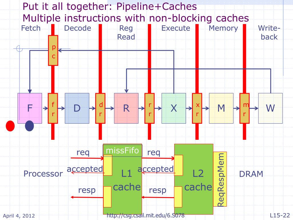 Put it all together: Pipeline+CachesMultiple instructions with non-blocking caches Fetch Decode RegRead Execute Memory Write-back req req pc accepted accepted resp resp F D R X M W fr dr rr xr mr missFifo L1 cache L2 cache Processor DRAM ReqRespMem http://csg.csail.mit.edu/6.S078