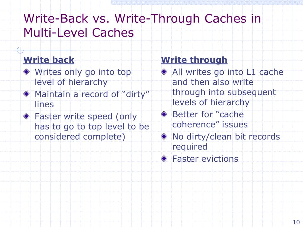 Write back Writes only go into top level of hierarchy Maintain a record of “dirty” lines Faster write speed (only has to go to top level to be considered complete) Write through All writes go into L1 cache and then also write through into subsequent levels of hierarchy Better for “cache coherence” issues No dirty/clean bit records required Faster evictions Write-Back vs. Write-Through Caches inMulti-Level Caches