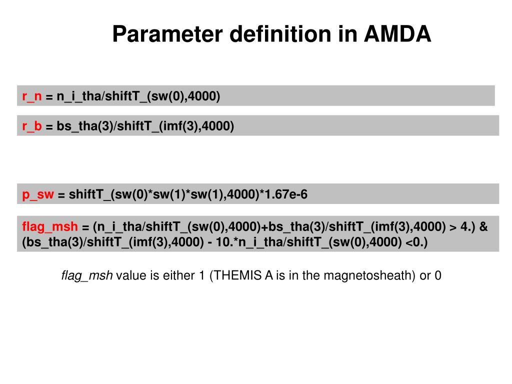 Parameter definition in AMDA r_n = n_i_tha/shiftT_(sw(0),4000) r_b = bs_tha(3)/shiftT_(imf(3),4000) p_sw = shiftT_(sw(0)*sw(1)*sw(1),4000)*1.67e-6 flag_msh = (n_i_tha/shiftT_(sw(0),4000)+bs_tha(3)/shiftT_(imf(3),4000) > 4.) & (bs_tha(3)/shiftT_(imf(3),4000) - 10.*n_i_tha/shiftT_(sw(0),4000) <0.) flag_msh value is either 1 (THEMIS A is in the magnetosheath) or 0