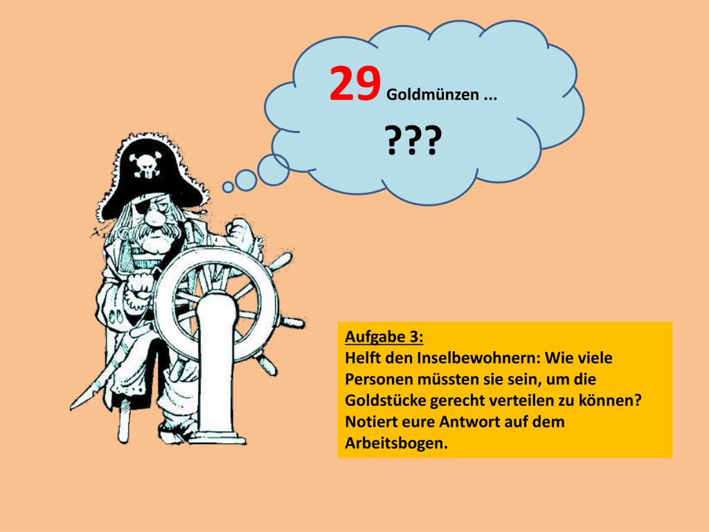 29Goldmünzen ... ??? Aufgabe 3: Helft den Inselbewohnern: Wie viele Personen müssten sie sein, um die Goldstücke gerecht verteilen zu können? Notiert eure Antwort auf dem Arbeitsbogen.