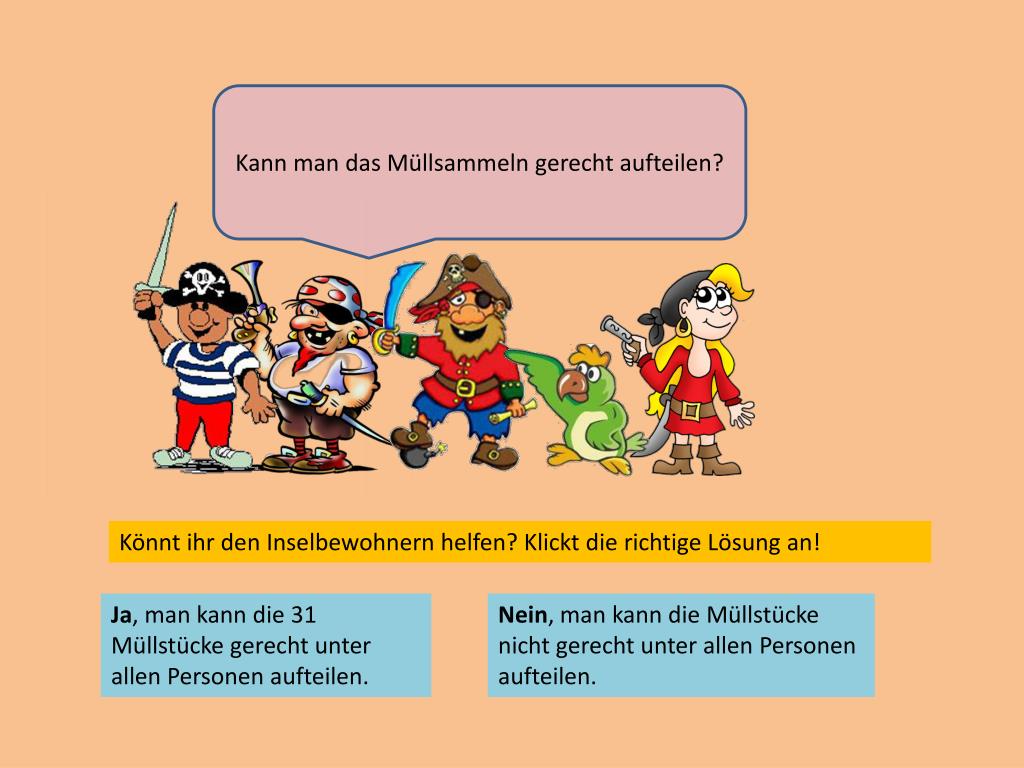Kann man das Müllsammeln gerecht aufteilen? Könnt ihr den Inselbewohnern helfen? Klickt die richtige Lösung an! Ja, man kann die 31 Müllstücke gerecht unter allen Personen aufteilen. Nein, man kann die Müllstücke nicht gerecht unter allen Personen aufteilen.