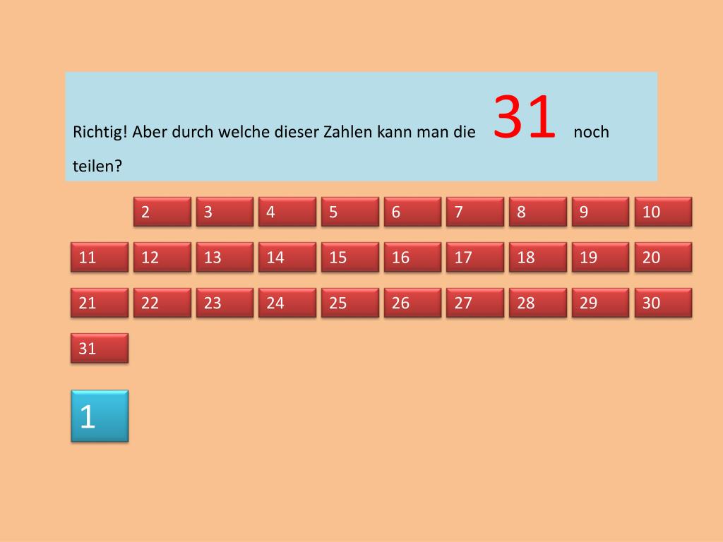 Überlegt mal: Durch welche dieser Zahlen kann man die 31 teilen? Klickt auf die richtigen Zahlen! 1 2 3 4 5 6 7 8 9 10 11 12 13 14 15 16 17 18 19 20 21 22 23 24 25 26 27 28 29 30 31