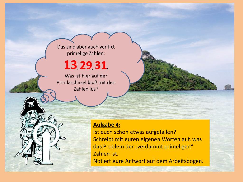 Ach Willi, ich glaube, als du zur Schule gegangen bist, gab es diesen Begriff noch nicht. Wenn man die Teiler einer Zahl sucht, dann sucht man alle Zahlen, durch die die Zahl teilbar ist! Die 4 zum Beispiel hat die Teiler 1,2 und 4. Schule? Ich war nie in der Schule! Und trotzdem bin ich Kapitän eines großen Schiffes geworden! Aufgabe 5: Hört auf Marys Rat und schreibt alle Teiler der Zahlen 13, 29 und 31 auf und notiert sie auf dem Arbeitsbogen. Fällt Euch nun etwas auf? Sprecht über eure Vermutung. Erst danach dürft ihr zur nächsten Folie wechseln!
