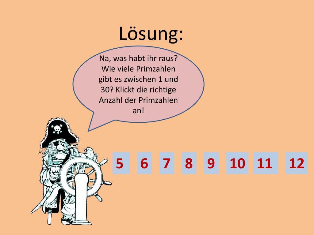 Lösung: Na, was habt ihr raus? Wie viele Primzahlen gibt es zwischen 1 und 30? Klickt die richtige Anzahl der Primzahlen an! 5 6 7 8 9 10 11 12