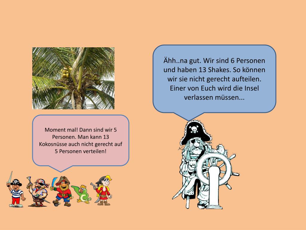 Na gut, ihr Besserwisser. Dann nehmen wir halt noch einen Piraten auf. Schiffe stranden hier ja genügend! Wenn wir noch Einen mehr aufnehmen, dann sind wir 7 Personen und 13 Kokosnüsse. So können wir die Shakes auch nicht gerecht verteilen!