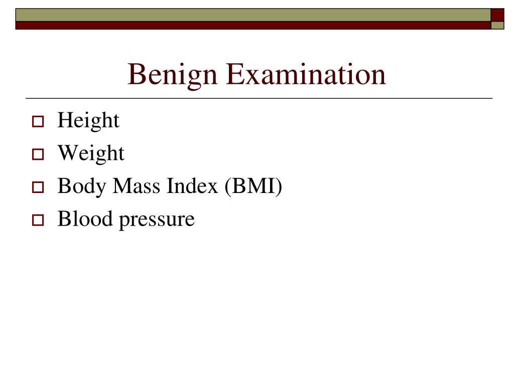 Benign Examination • Height • Weight • Body Mass Index (BMI) • Blood pressure