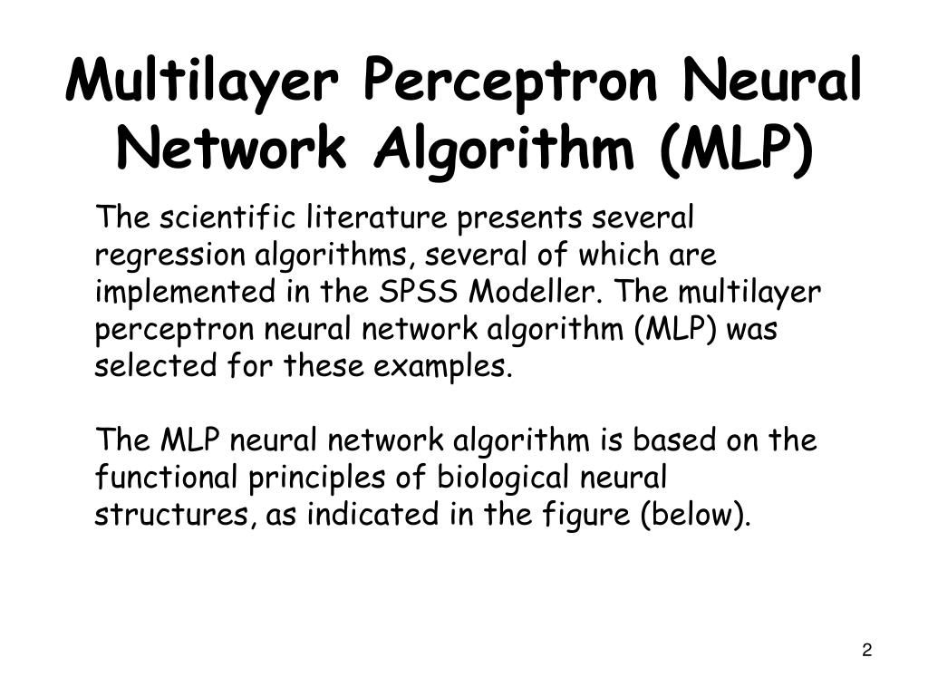 The scientific literature presents several regression algorithms, several of which are implemented in the SPSS Modeller. The multilayer perceptron neural network algorithm (MLP) was selected for these examples. The MLP neural network algorithm is based on the functional principles of biological neural structures, as indicated in the figure (below). Multilayer Perceptron Neural Network Algorithm (MLP)