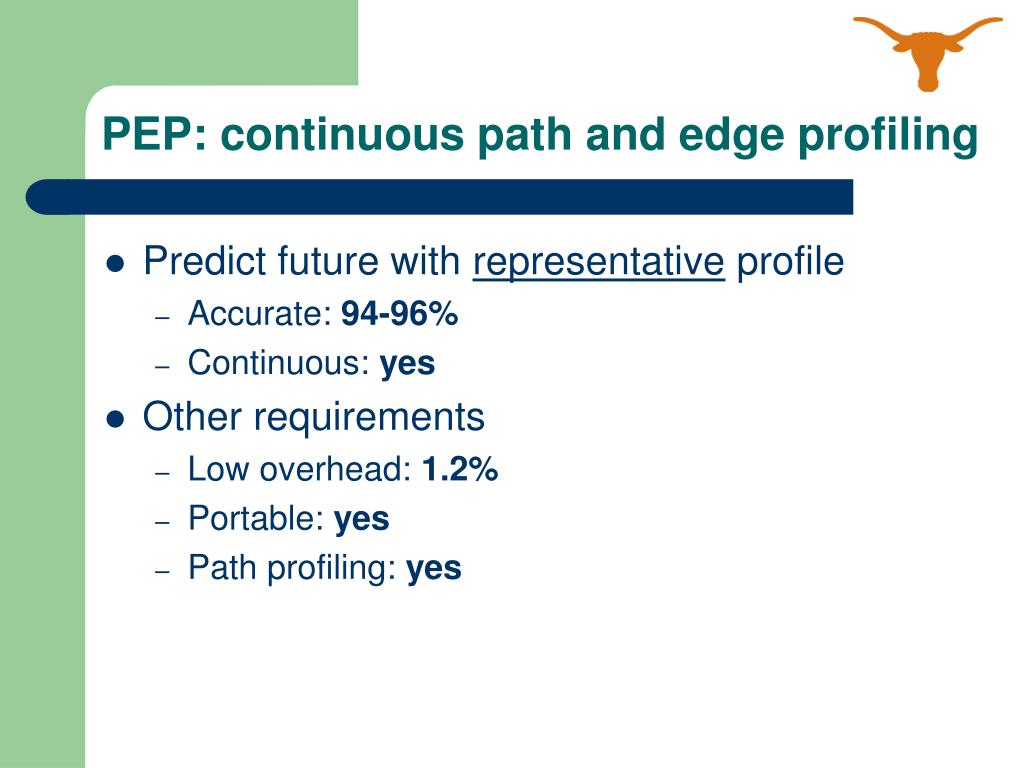 PEP: continuous path and edge profiling • Predict future with representative profile • Accurate: 94-96% • Continuous: yes • Other requirements • Low overhead: 1.2% • Portable: yes • Path profiling: yes