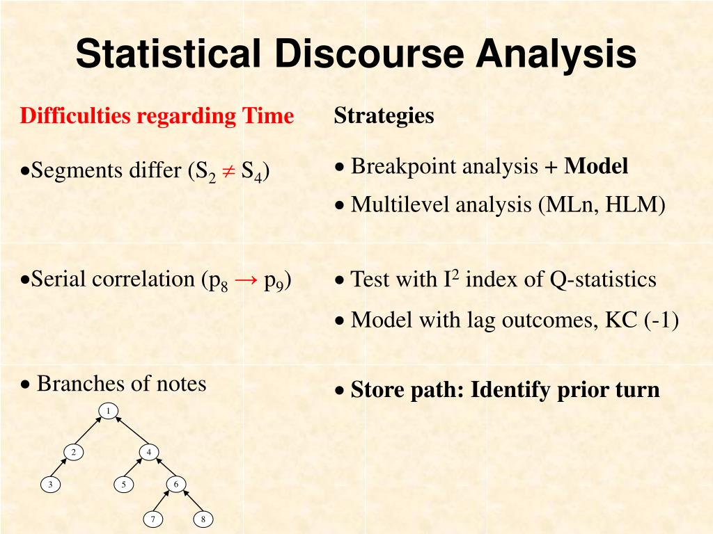 Statistical Discourse Analysis 4 types of Analytical Difficulties • Time • Outcomes • Explanatory variables • Dataset - No missing data