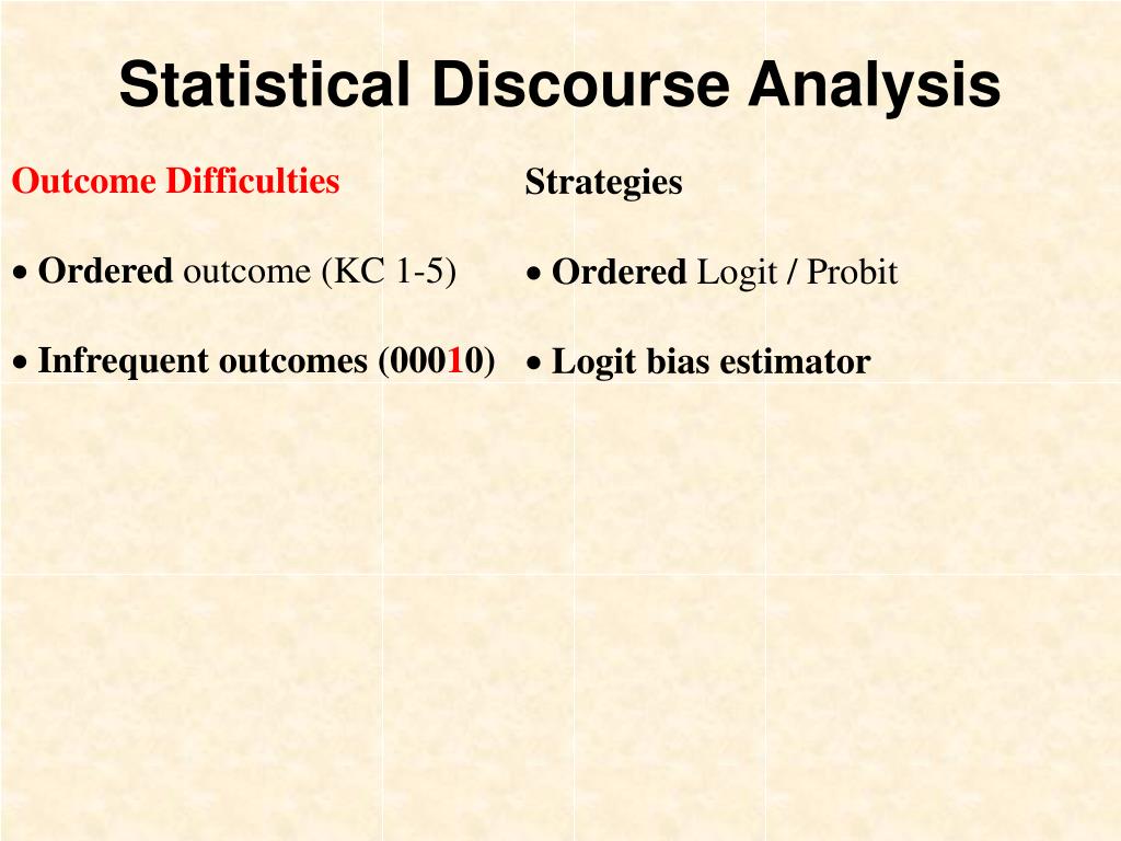 Statistical Discourse Analysis Outcome Difficulties Ordered outcome (KC 1-5) Infrequent outcomes (00010) Strategies Ordered Logit / Probit Logit bias estimator