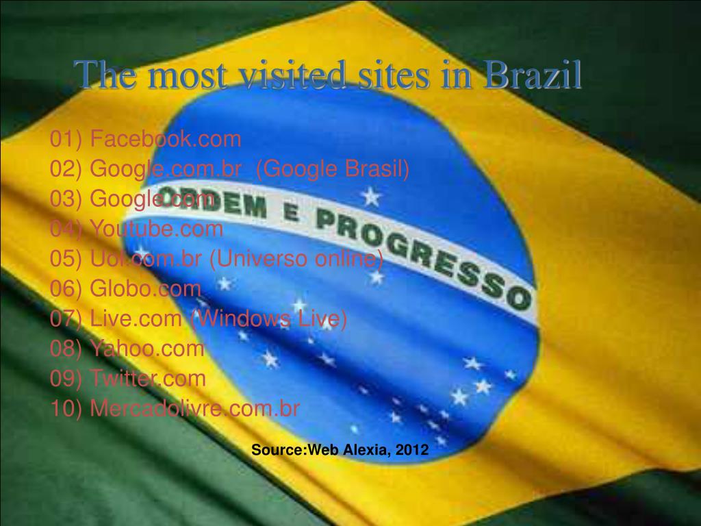 Source:Web Alexia, 2012 The most visited sites in Brazil 01) Facebook.com 02) Google.com.br (Google Brasil) 03) Google.com 04) Youtube.com 05) Uol.com.br (Universo online) 06) Globo.com 07) Live.com (Windows Live) 08) Yahoo.com 09) Twitter.com 10) Mercadolivre.com.br