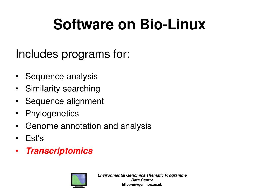 Environmental Genomics Thematic Programme Data Centre http://envgen.nox.ac.uk Bio-LinuxThe EGTDC distribution system for bioinformatics solutions • Key bioinformatics software and documentation in a Linux environment • Aim: to maximise the benefits of a pre-installed analysis system. • provision of key software • tools for automation of analysis and other customisations • computing power • ensure that what is provided can be reasonably maintained and supported