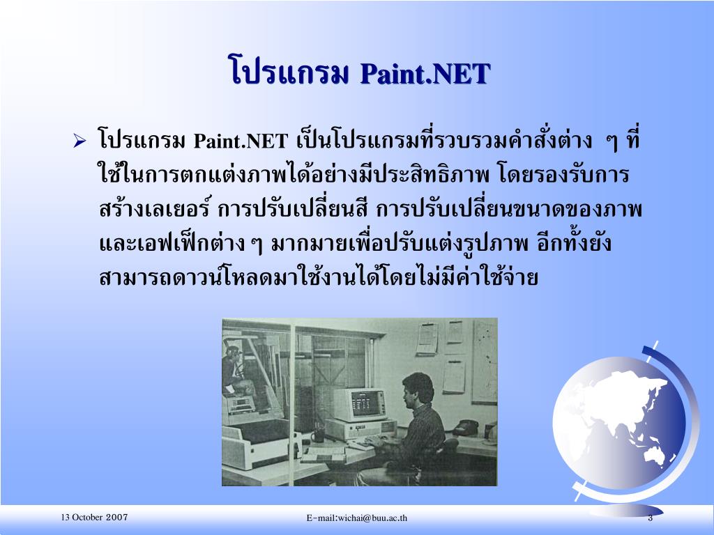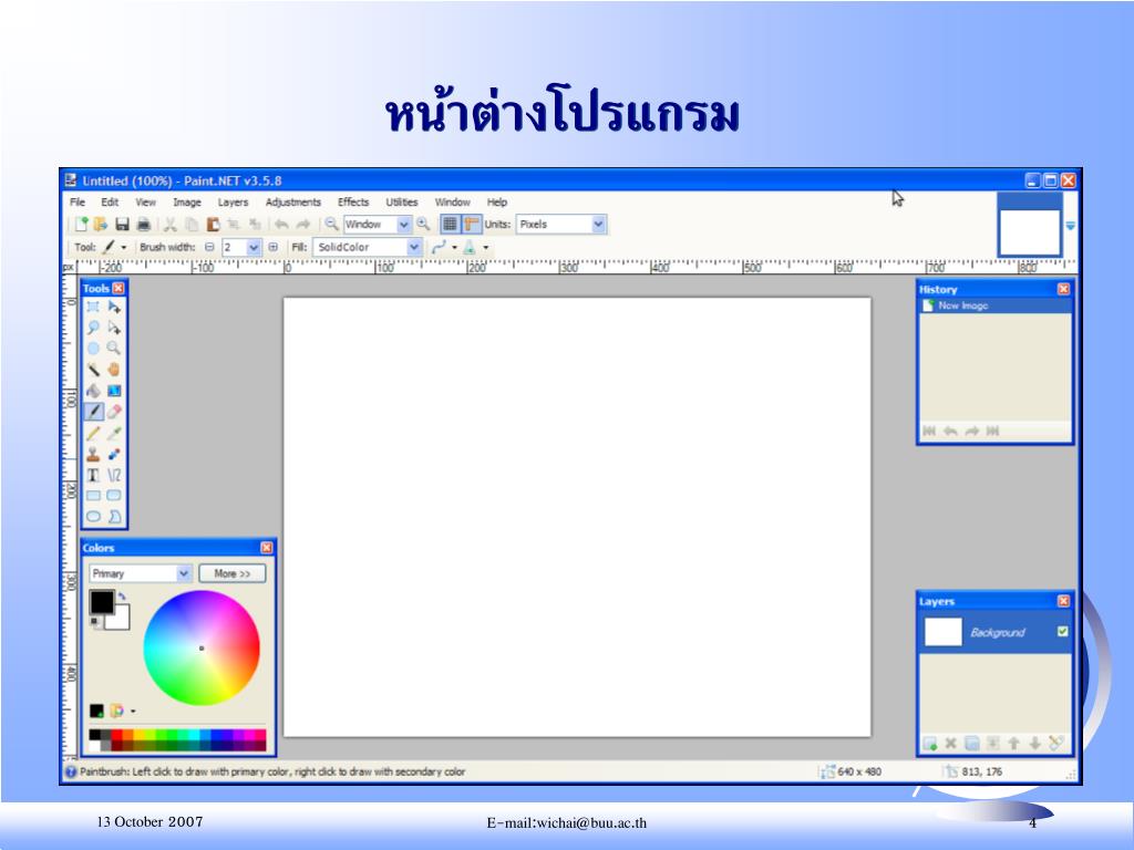 โปรแกรม Paint.NET • โปรแกรม Paint.NET เป็นโปรแกรมที่รวบรวมคำสั่งต่าง ๆ ที่ใช้ในการตกแต่งภาพได้อย่างมีประสิทธิภาพ โดยรองรับการสร้างเลเยอร์ การปรับเปลี่ยนสี การปรับเปลี่ยนขนาดของภาพ และเอฟเฟ็กต่างๆ มากมายเพื่อปรับแต่งรูปภาพ อีกทั้งยังสามารถดาวน์โหลดมาใช้งานได้โดยไม่มีค่าใช้จ่าย E-mail:wichai@buu.ac.th
