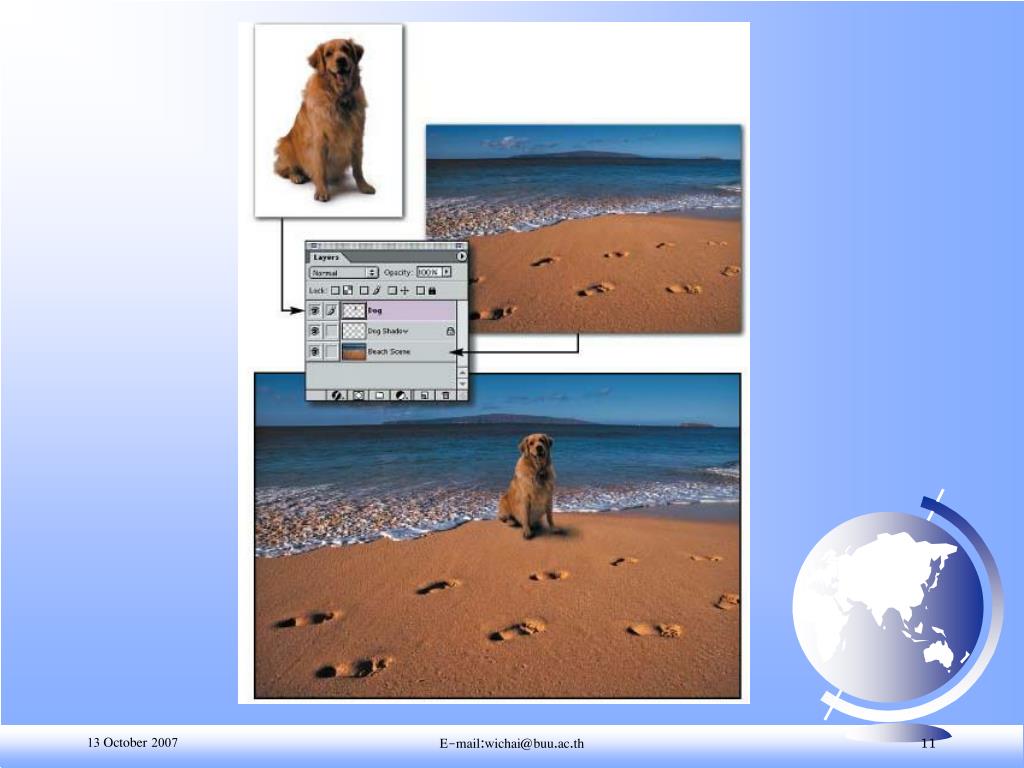 การซ้อนภาพ (เลเยอร์: Layers) • คำสั่งสำหรับเลือกส่วนของรูปภาพ4 คำสั่งคือ • • Rectangle Select สำหรับเลือกส่วนของรูปภาพเป็นพื้นที่สี่เหลี่ยม • • Lasso Select สำหรับเลือกส่วนของรูปภาพแบบอิสระ • • Ellipse Select สำหรับเลือกส่วนของรูปภาพเป็นพื้นที่วงกลมหรือวงรี • • Magic Wand สำหรับเลือกส่วนของรูปภาพที่มีสีเดียวกัน E-mail:wichai@buu.ac.th