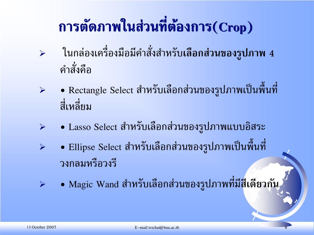 การตัดภาพในส่วนที่ต้องการ(Crop)การตัดภาพในส่วนที่ต้องการ(Crop) • ในกล่องเครื่องมือมีคำสั่งสำหรับเลือกส่วนของรูปภาพ4 คำสั่งคือ • • Rectangle Select สำหรับเลือกส่วนของรูปภาพเป็นพื้นที่สี่เหลี่ยม • • Lasso Select สำหรับเลือกส่วนของรูปภาพแบบอิสระ • • Ellipse Select สำหรับเลือกส่วนของรูปภาพเป็นพื้นที่วงกลมหรือวงรี • • Magic Wand สำหรับเลือกส่วนของรูปภาพที่มีสีเดียวกัน E-mail:wichai@buu.ac.th