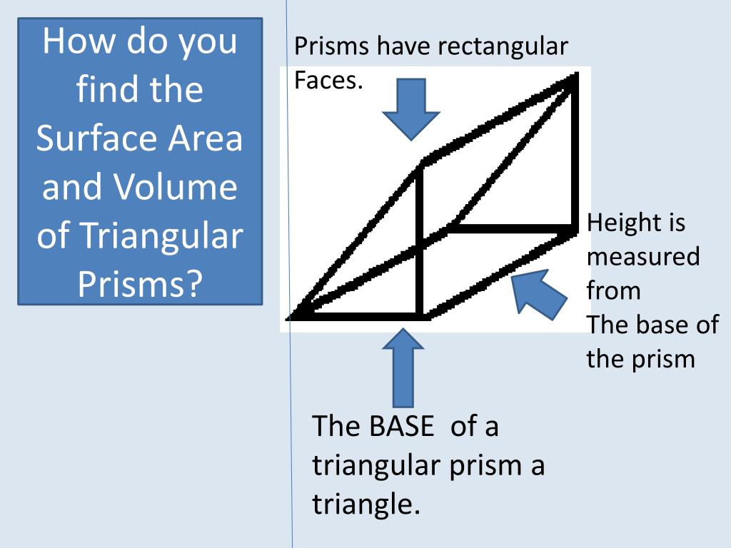 How do you find the Surface Area and Volume of Triangular Prisms? Prisms have rectangular Faces. Height is measured from The base of the prism The BASE of a triangular prism a triangle.