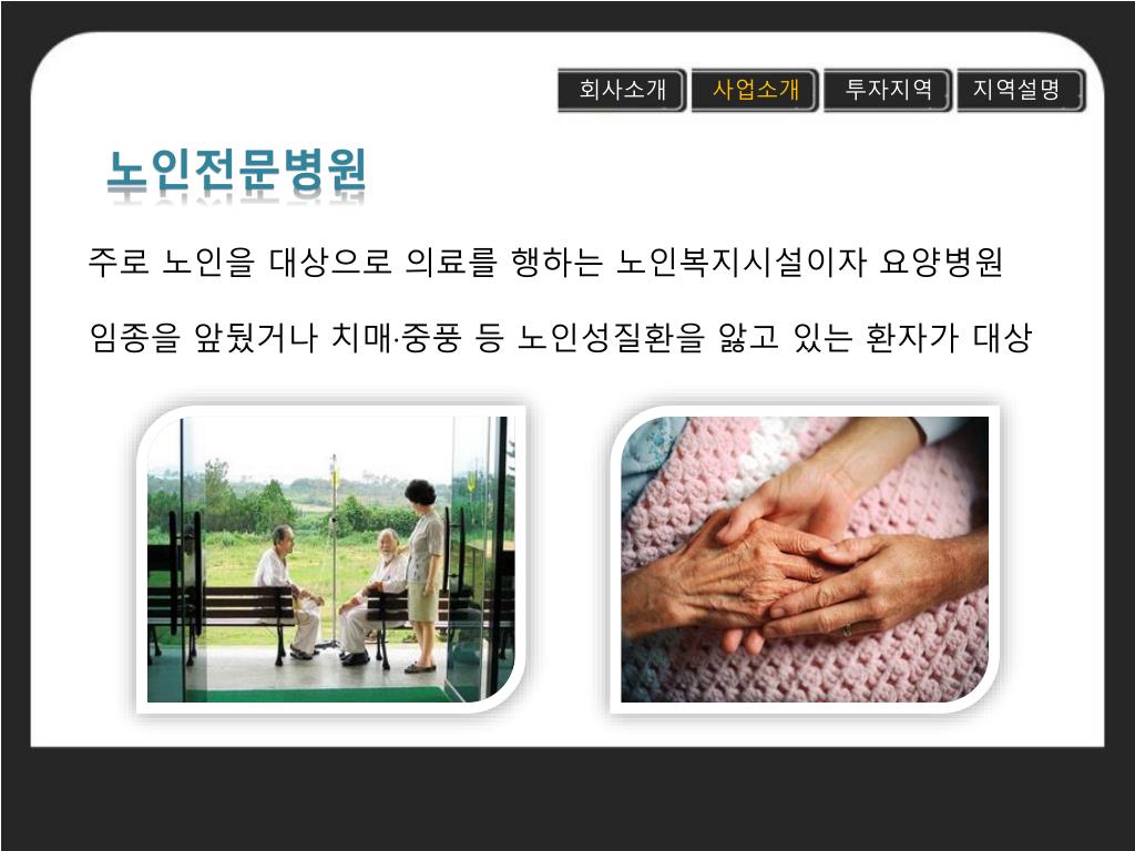 회사소개 사업소개 투자지역 지역설명 노인전문병원 주로 노인을 대상으로 의료를 행하는 노인복지시설이자 요양병원 임종을 앞뒀거나 치매·중풍 등 노인성질환을 앓고 있는 환자가 대상
